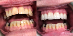 Patient Concerns: Patient was worried about decay around crowns and fillings that she had done by another dentist. She was unhappy with her smile’s appearance including the yellowish color of teeth, ill-fitting crowns, and gum inflammation. She was also struggling to chew food well due to issues with her bite.