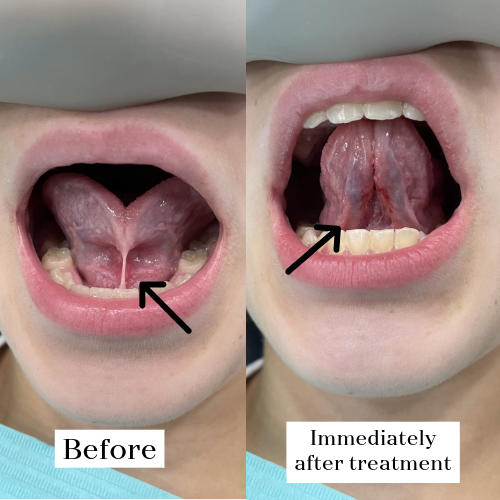 Treatment: Laser lingual, labial, and buccal frenectomy by Dr. Huffman to release ties.