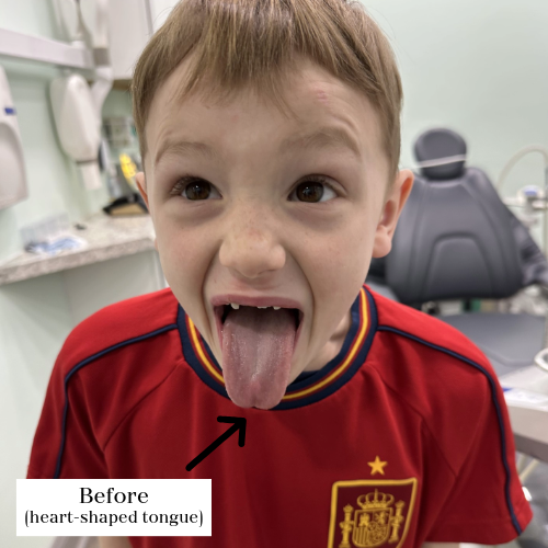 Doctor Diagnosis: Patient suffering from a tight posterior tongue tie. In the bottom image, you can see that the band of fascia under the tongue (lingual frenulum) is too tight which is pulling the tip of the tongue into a notched or heart shaped which is often an indicator of tongue tie when associated with symptoms.